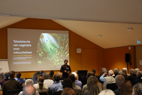 Vervolgens was het woord aan Prof. dr. ir. Wim van der Putten. Hij behandelde de relatie tussen de ondergrond en de bovengrond. Wat leeft er allemaal ondergronds en wat kunnen we ermee bij het beheren en onderhouden van de natuur? Zijn boodschap: het is het belangrijkst om de ‘stikstofregen’ te stoppen, maar om de achteruitgang niet te hard te laten gaan en de biodiversiteit te stimuleren, kan de samenstelling van de bodem gestuurd worden. Denk hierbij aan herstelmaatregelen als bodemtransplantatie en het toevoegen van steenmeel.